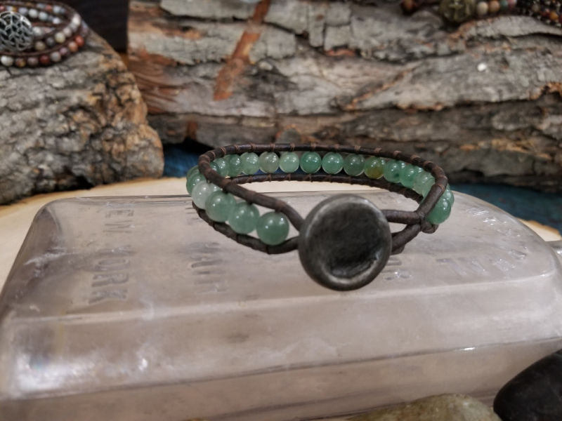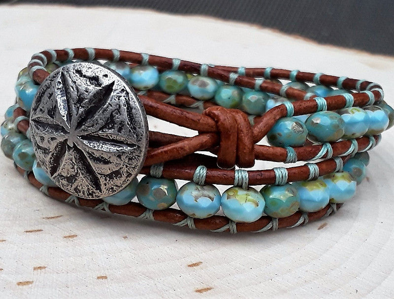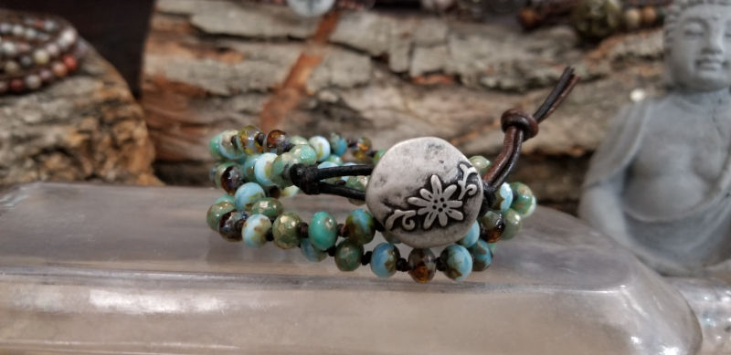 Tan and Turquoise Czech Glass with Rustic Floral Button